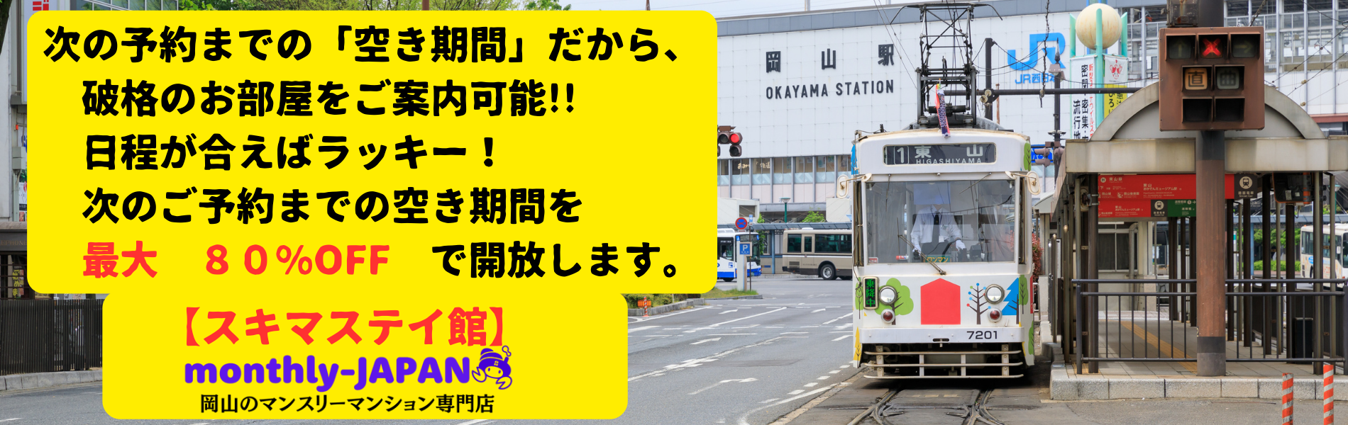 1月23日(金)から2月25日(水)までの期間限定で、次のご予約までの「空き期間」を活用した格安スキマステイ入… 続きを読む: 【1/23〜2/25限定】初期費用0円!1泊3,260円で住めるお得なスキマステイ募集 (7日以上〜)SA鹿田町A - 【3/8〜4/3限定】初期費用0円!1泊3,260円で住めるお得なスキマステイ募集 (7日以上〜)GG清輝本町A
